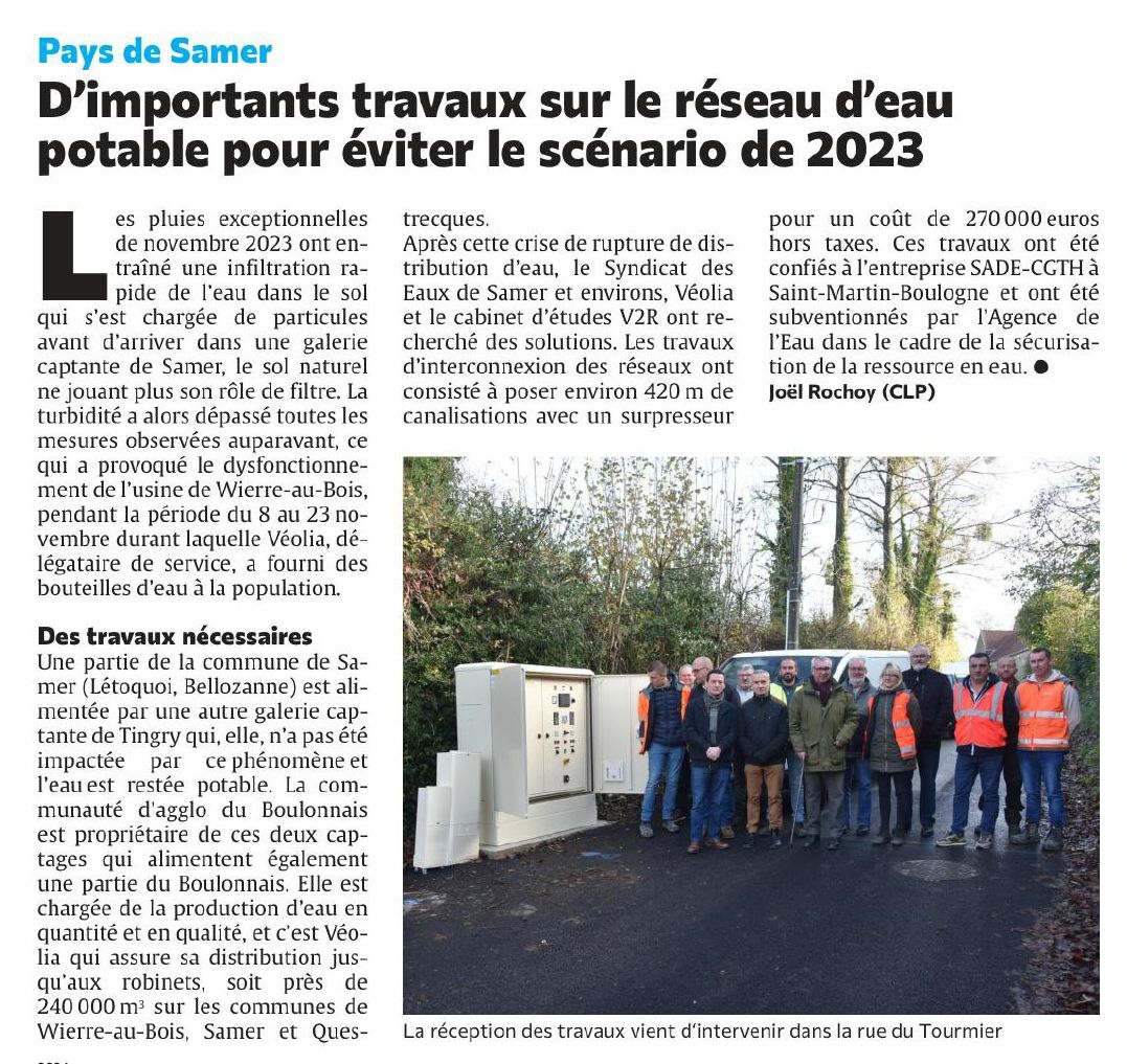 Créé en 2009, le Syndicat des eaux de Samer regroupe les communes de Carly, Questrecques, Samer, Tingry, Verlinthun et Wierre-au-Bois et dessert 2 900 abonnés pour 6 800 habitants.